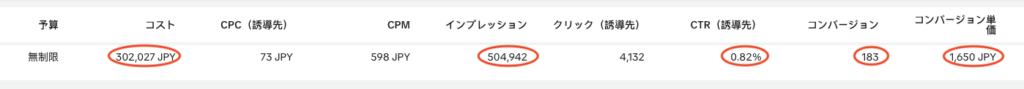 費用302,027円で配信を行い、インプレッション数は504,942回という結果となりました。