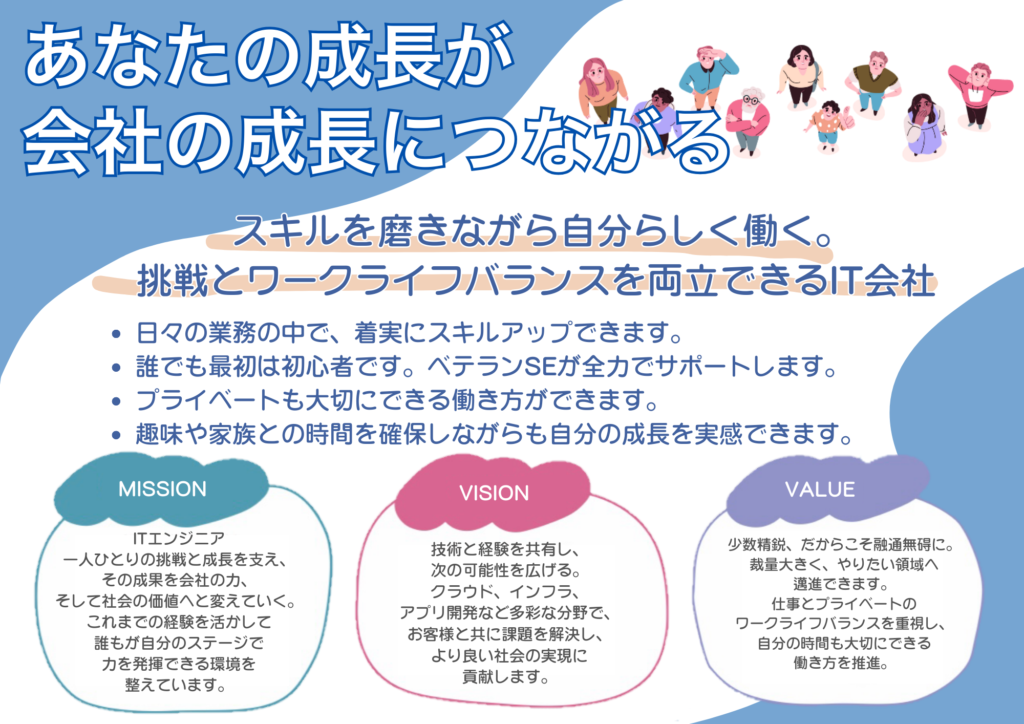 本来求めているのは、ITインフラ・ネットワーク・サーバー領域での実務に携わりながら、現場で着実に経験を積み、長く活躍できる人材です。