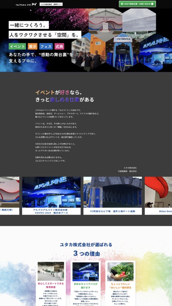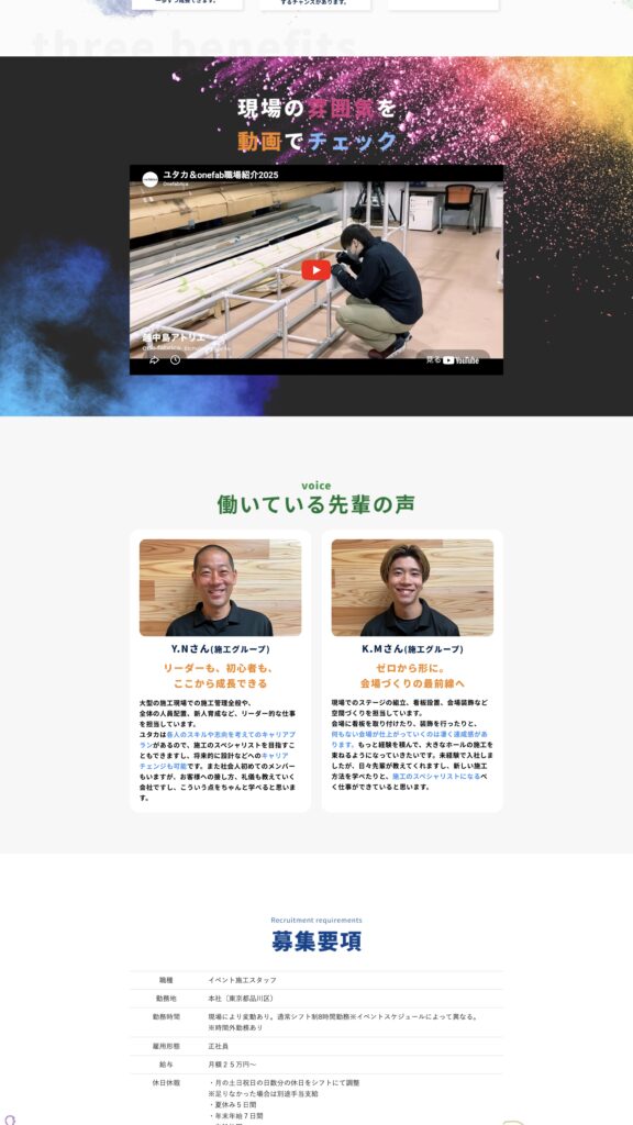 また、新人に寄り添いながら成長を支える社内の雰囲気や、仲の良い職場環境についても発信することで、未経験の方でも安心して働くイメージを持ちやすい構成にしています。さらに、イベントの仕事は今後も必要とされ続ける仕事であることや、施工の中で発生する廃材に対してSDGsの観点から取り組みを行っていることにも触れ、企業としての考え方や社会への向き合い方も伝えました。