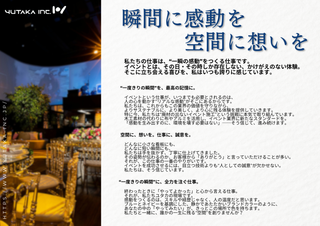 動画では、その日のその瞬間を形にし、お客様に楽しんでもらいたいというイベントの仕事ならではの想いや、ものづくり・資料づくりの両面にこだわる会社の姿勢を分かりやすく伝えています。あわせて、仕事に対して真面目に真摯に向き合う社員の姿を通して、会社としての魅力が自然に伝わる内容を設計しました。