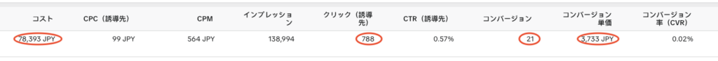 TikTok広告では、78,393円の広告費で788件のクリックを獲得し、CPAは3,733円で21件のお問い合わせ獲得につながりました。
