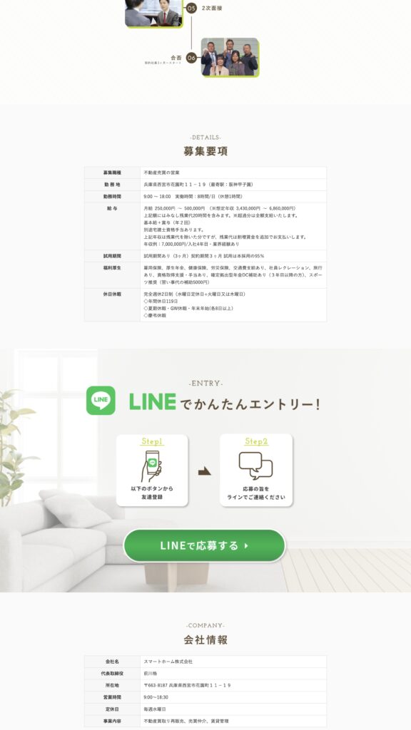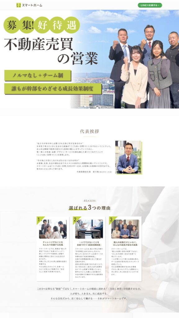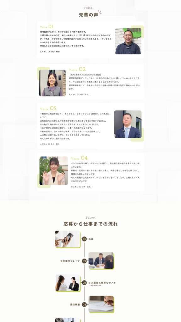 特に、待遇や条件だけでは伝わりにくい「どんな想いで仕事をしている会社なのか」「どんな人がこの会社に合うのか」といった部分まで丁寧に整理することで、企業理解を深めながら応募につなげられる構成としています。
