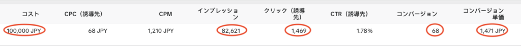 TikTok広告では、広告費10万円の配信に対して、82,621回のインプレッションを獲得し、1,469件のクリックにつながりました。一定数のユーザーを効率よく誘導できた結果となっています。