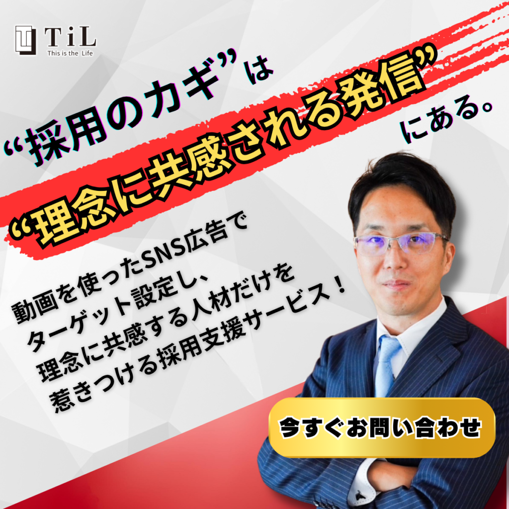 TiL株式会社では、採用ブランディングの設計から動画・バナー制作、広告配信、LP設計、LINE導線まで一気通貫で支援しています。