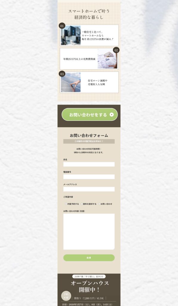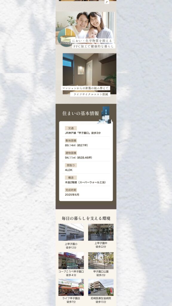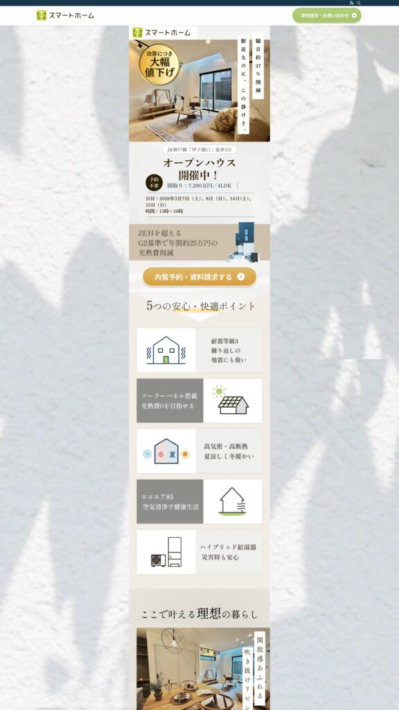 設備や性能、間取りといった基本情報だけでなく、「この住まいでどんな毎日が送れるのか」という視点まで丁寧に整理することで、物件理解を深めながらお問い合わせにつなげやすい構成としています。