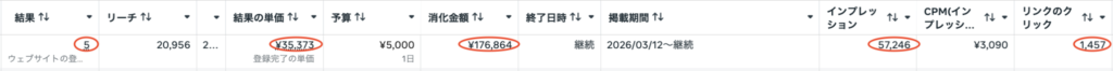 また、配信期間中に5件のお問い合わせを獲得しており、CPAは35,373円でした。認知拡大やクリック獲得にはつながっている一方で、最終的なお問い合わせまでの転換率には改善の余地がある結果となりました。
