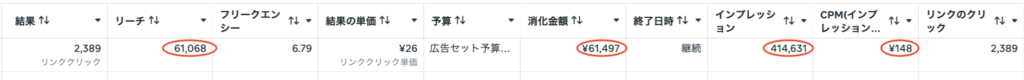 また、消化金額は61,497円、CPMは148円となっており、広告を比較的効率よく配信できていたことが分かります。